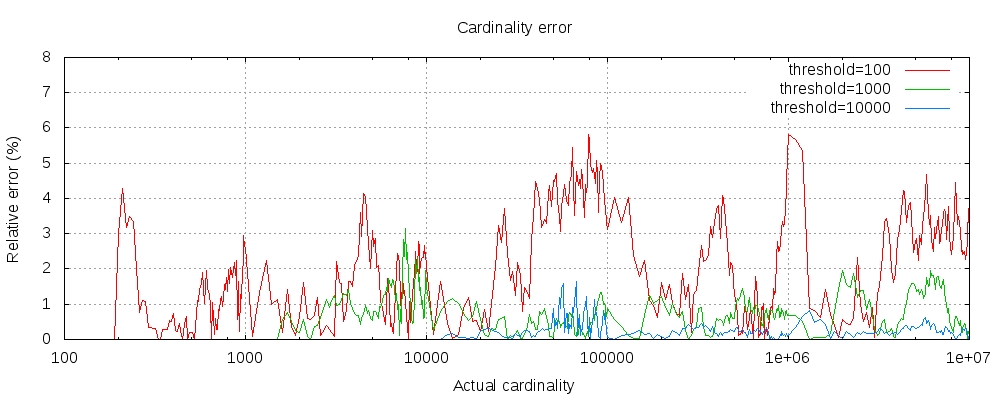 还请注意,即使阈值低至100,即使计数数百万个项目,误差仍然非常低。